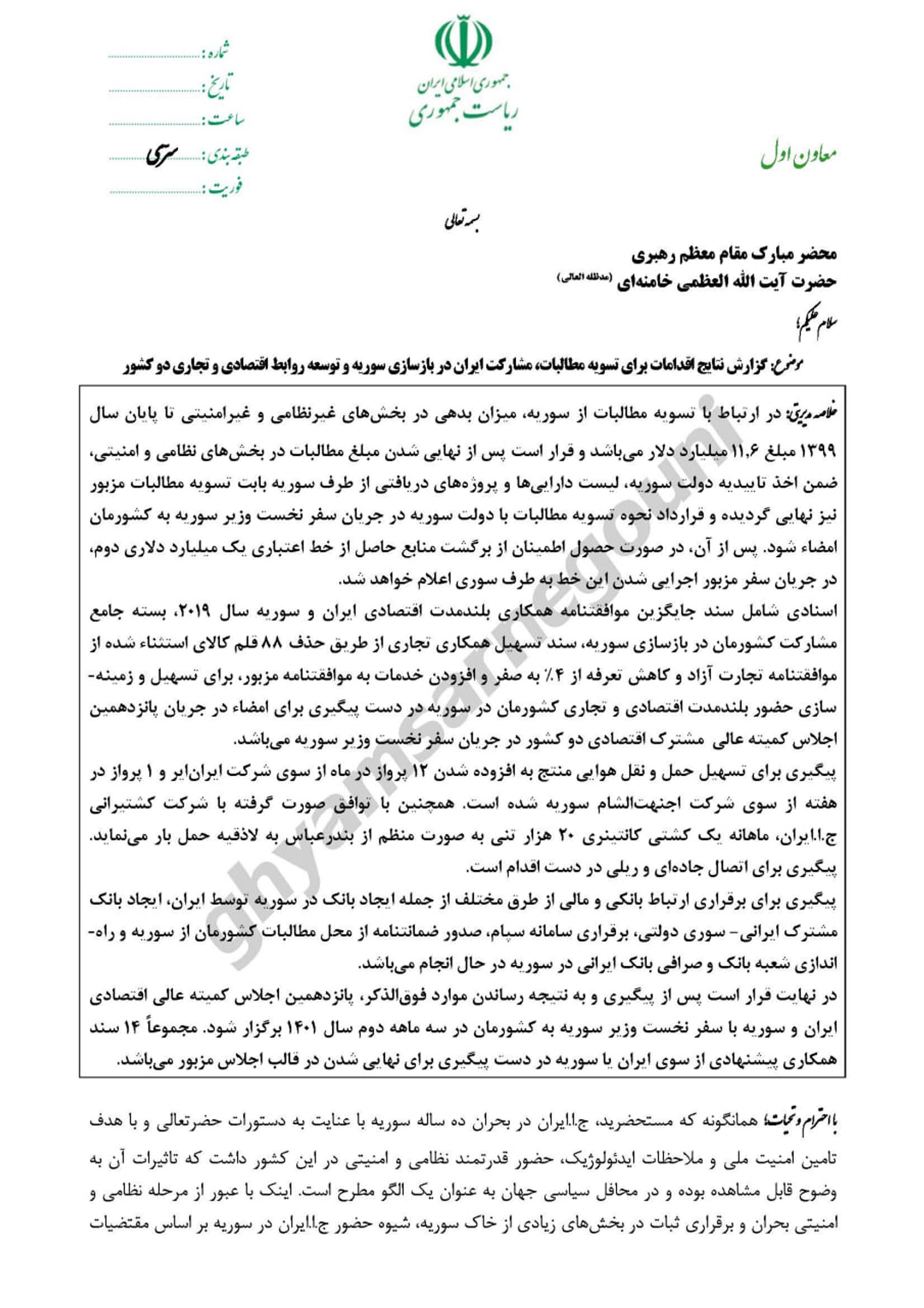 بر اساس یکی از اسناد منتشر شده توسط این گروه، محمد مخبر، معاون اول ابراهیم رئیسی در نامه به علی خامنه‌ای بدهی‌های سوریه به ایران در بخش‌های غیر نظامی و غیر امنیتی را حدود ۱۱.۶میلیارد دلار تا سال ۱۳۹۹ اعلام کرده است.