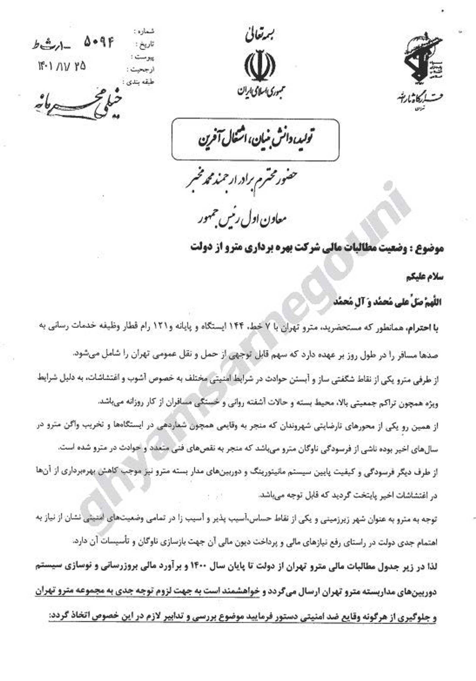 یکی از اسناد نامه فرمانده کل سپاه پاسداران به معاون اول رئیسی درباره دوربین‌های مداربسته مترو، هزینه نوسازی آنها و همچنین طلب شرکت مترو از دولت است.