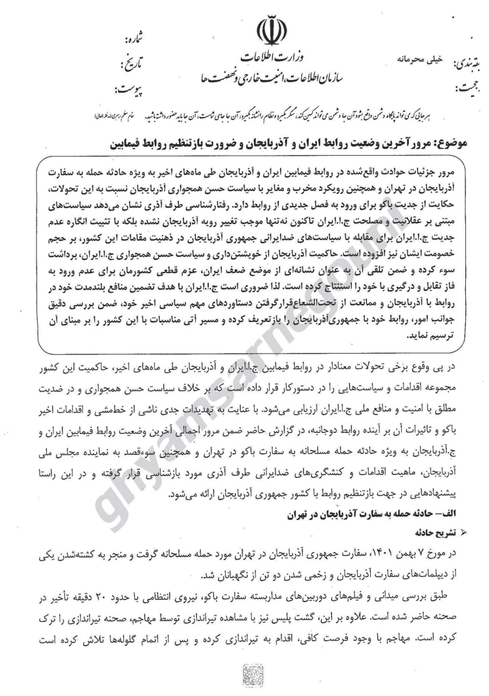 در یکی از اسناد منتشر شده توسط گروه «قیام تا سرنگونی» نیز نامه وزارت اطلاعات درباره روابط جمهوری اسلامی و جمهوری آذربایجان منتشر شده است. در یکی از این نامه‌ها اعلام شده که نیروی انتظامی پس از حمله اخیر با ۲۰ دقیقه تاخیر در محل سفارت جمهوری آذربایجان حضور یافته است.