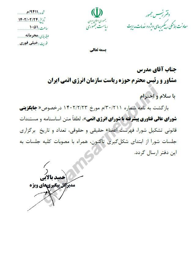 در نامهای دیگر به تاریخ ۲۴ اردیبهشت از سوی معاونت هماهنگی، پیگیریهای ویژه و خدمات مدیریت دفتر ریاستجمهوری، خطاب به سازمان انرژی اتمی به «جایگزینی شورای عالی فنآوری پیشرفته با شورای انرژی اتمی» اشاره شده است.