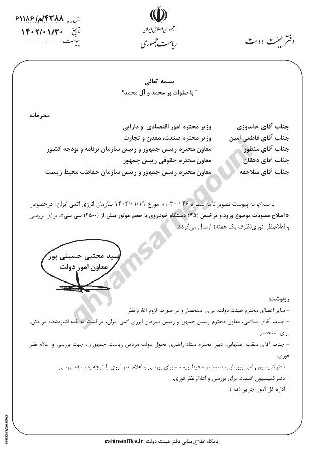 گروه هکری «قیام تا سرنگونی» همچنین سندی را منتشر کرد که حاوی اطلاعاتی درباره درخواست سازمان انرژی اتمی برای اصلاح مصوبات «ورود و ترخیص ۳۵ دستگاه خودرو با حجم موتور بیش از دو هزار و ۵۰۰ سیسی» است.