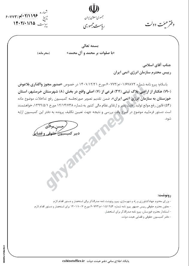 در این سند (نامه) به تاریخ ۲۱ اسفند سال گذشته، به «صدور مجوز واگذاری بلاعوض ۱۹۰ هکتار از اراضی» واقع در خرمشهر در استان خوزستان به سازمان انرژی اتمی اشاره شده و به پیوست، تصویر صورتجلسه کمیسیون رفع تداخلات قانون رفع موانع تولید مبنی بر «احراز تداخل» آمده است.