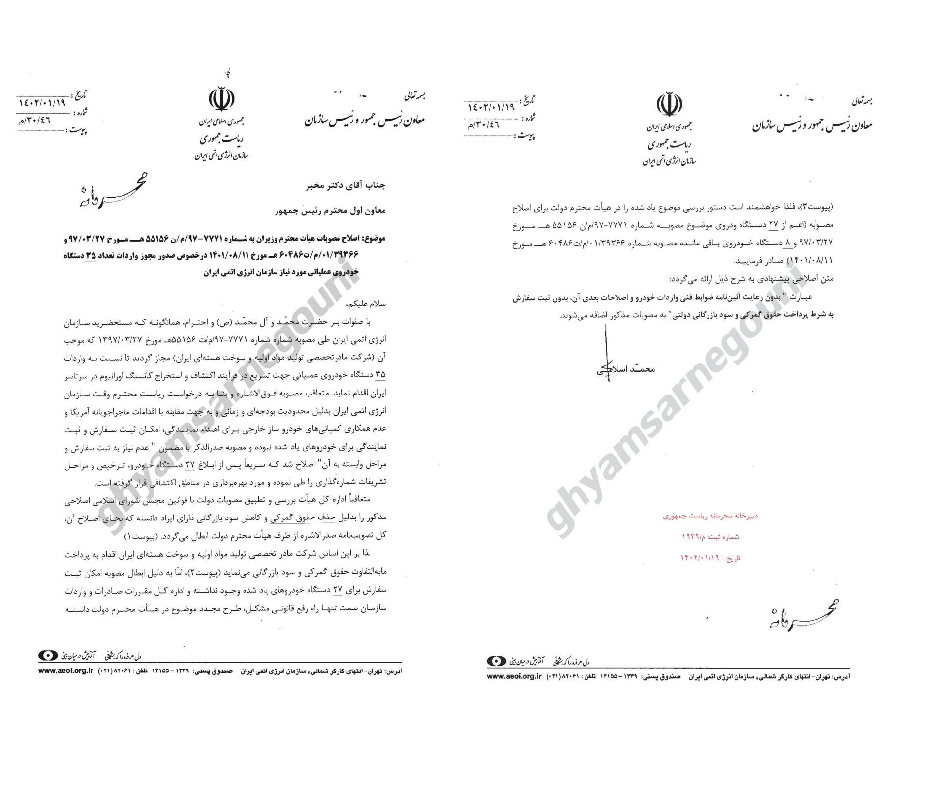 پیوست این نامه که به تاریخ ۳۰ فروردین از سوی مجتبی حسینیپور، معاون امور دولت خطاب به وزیران اقتصاد، صنعت، معدن و تجارت (صمت)، رییس سازمان برنامه و بودجه، معاون حقوقی رئیسی و رییس سازمان حفاظت محیط زیست منتشر شده، متن نامه مورخه ۱۹ فروردین محمد اسلامی درباره صدور مجوز برای واردات «۳۵ خوردوی عملیاتی مورد نیاز سازمان انرژی اتمی» خطاب به محمد مخبر آمده است.