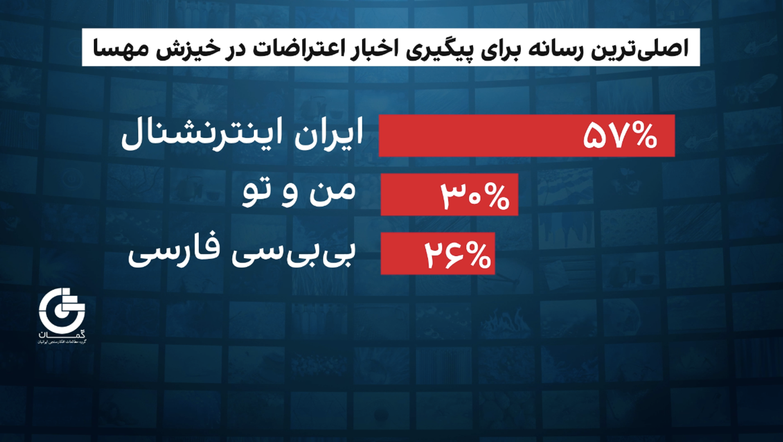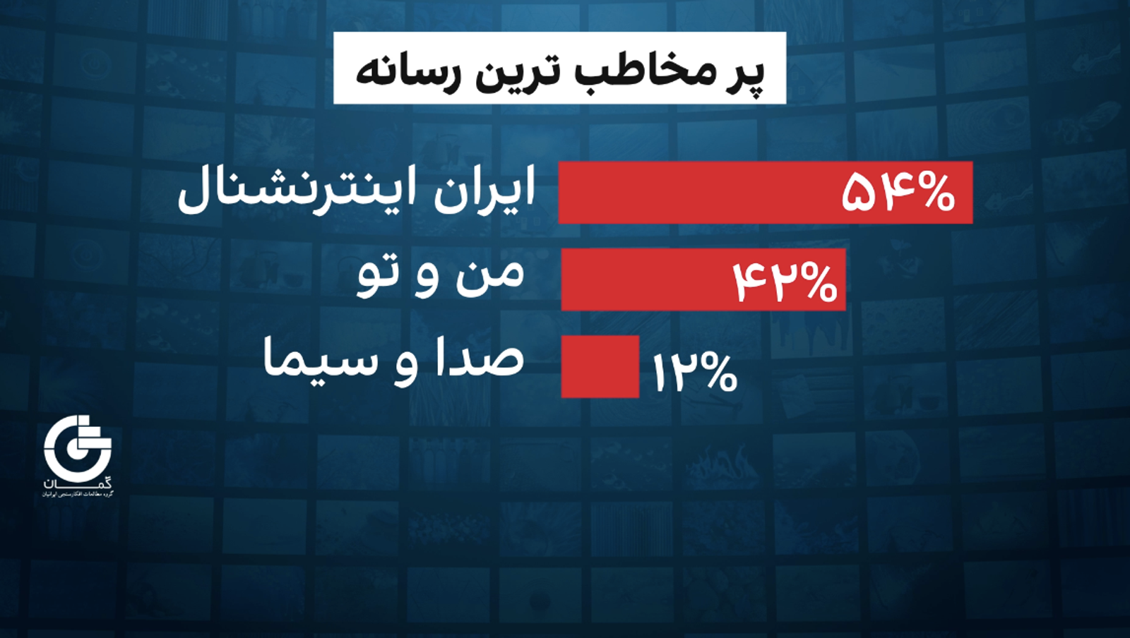 در رتبه‌های بعدی هم من‌وتو با ۳۰ درصد، بی‌بی‌سی فارسی با ۲۶ درصد و صدای آمریکا با ۲۰ درصد قرار دارند.