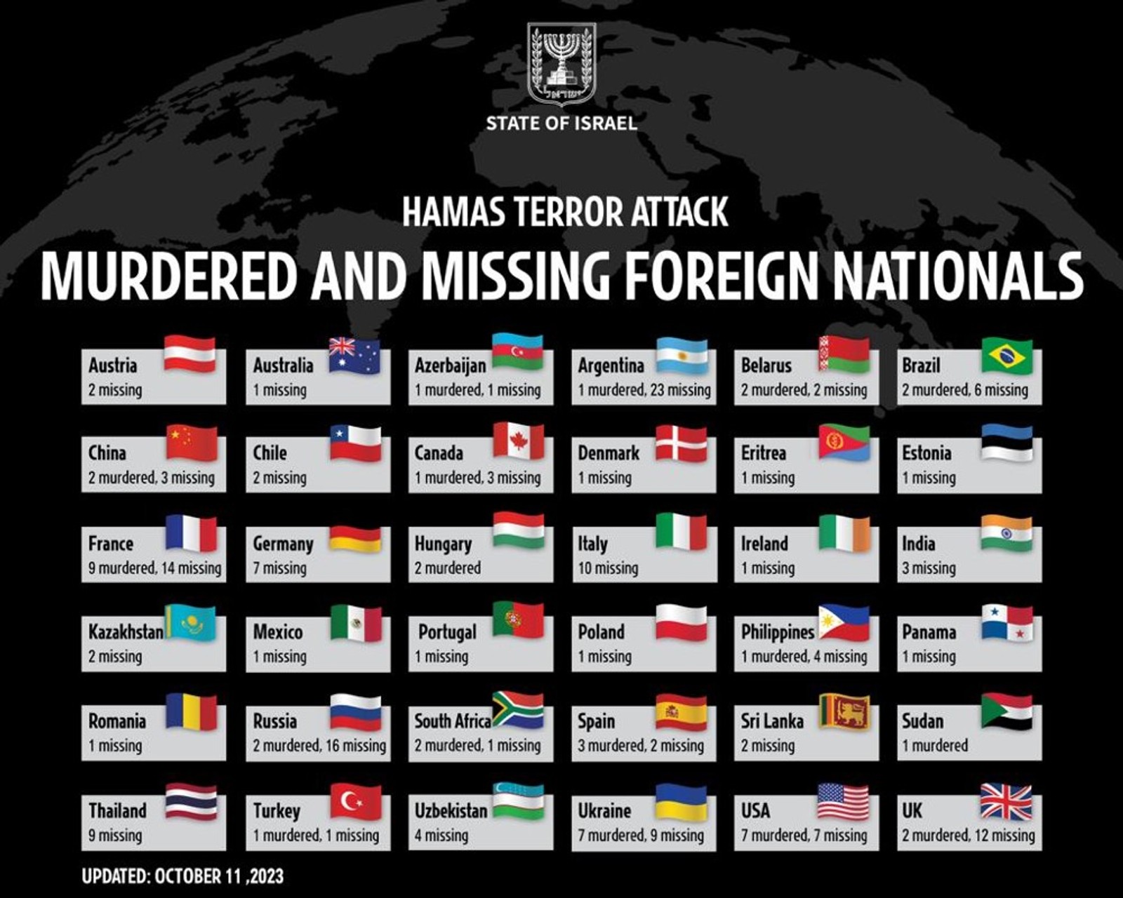 اسرائیل روز پنج‌شنبه ۲۰ مهر خبر داد در جریان تهاجم حماس، تعدادی از شهروندان کشورهای آذربایجان، آرژانتین، آفریقای جنوبی، آلمان، آمریکا، اتریش، ازبکستان، استرالیا، اوکراین، اریتره، اسپانیا، استونی، ایتالیا، ایرلند، برزیل، بلاروس، بریتانیا، پاناما، پرتغال، تایلند، ترکیه، چین، دانمارک، روسیه، رومانی، سری‌لانکا، سودان، شیلی، فرانسه، قزاقستان، فیلیپین، کانادا، لهستان، مجارستان، مکزیک و هند کشته یا مفقوده شده‌اند.