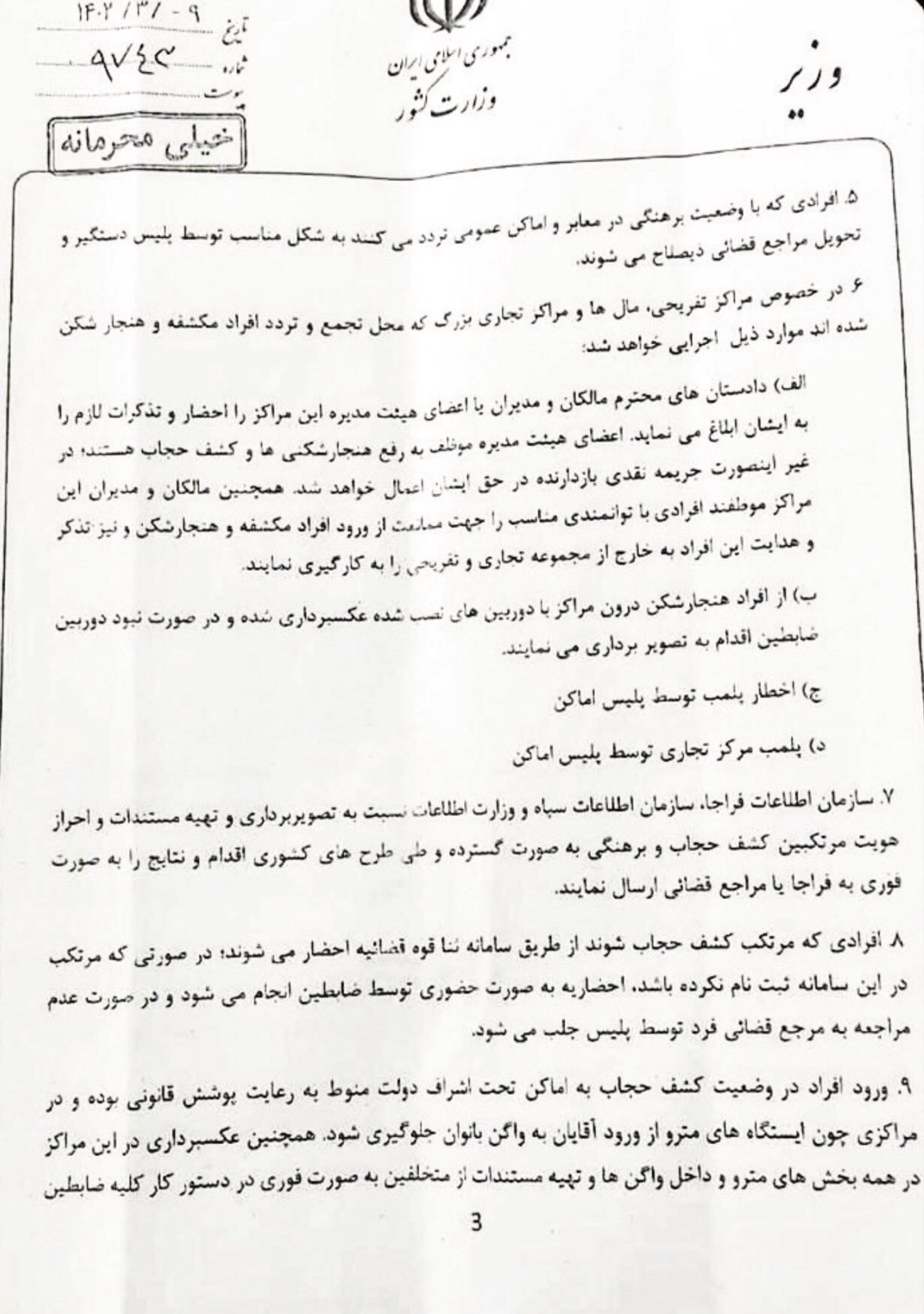 در این بخشنامه که به تاریخ نهم خرداد منتشر شده، خطاب به برخی دستگاه‌های جمهوری اسلامی از جمله شهرداری تهران و شرکت مترو پایتخت آمده: «ورود افراد در وضعیت کشف حجاب به اماکن تحت اشراف دولت منوط به رعایت پوشش قانونی بوده است.»