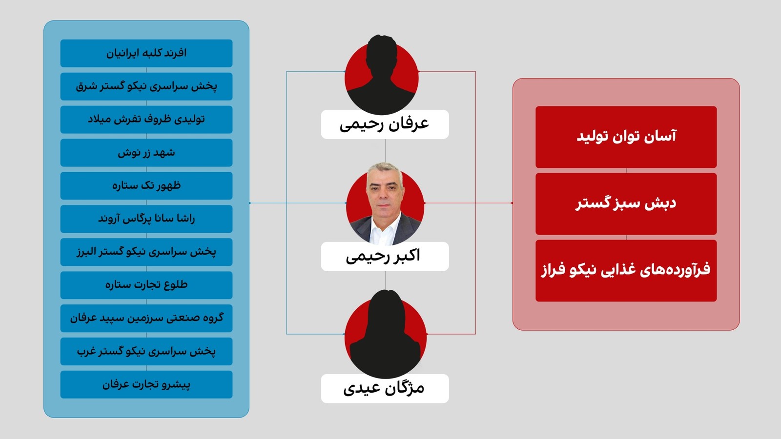 این فهرست نشان می‌دهد اکبر رحیمی با کد ملی ۰۰۵۱۸۱۱۹۰۱ و مژگان عیدی با کد ملی ۰۰۵۸۷۸۵۸۴۱، از طریق سه شرکت دبش سبز گستر با شناسه ملی ۱۰۱۰۲۷۶۳۱۲۸، فرآورده‌های غذایی نیکو فراز به شناسه ملی ۱۰۱۰۲۴۸۹۷۵۰ و شرکت آسان توان تولید به شناسه ملی ۱۰۸۶۱۸۰۶۱۶۲ از سال ۱۳۹۷ تا اردیبهشت ۱۴۰۰ مجموعا حدود ۴۶ میلیون یورو برابر حدودا ۴۳ میلیون دلار ارز نیمایی دریافت کرده‌اند.