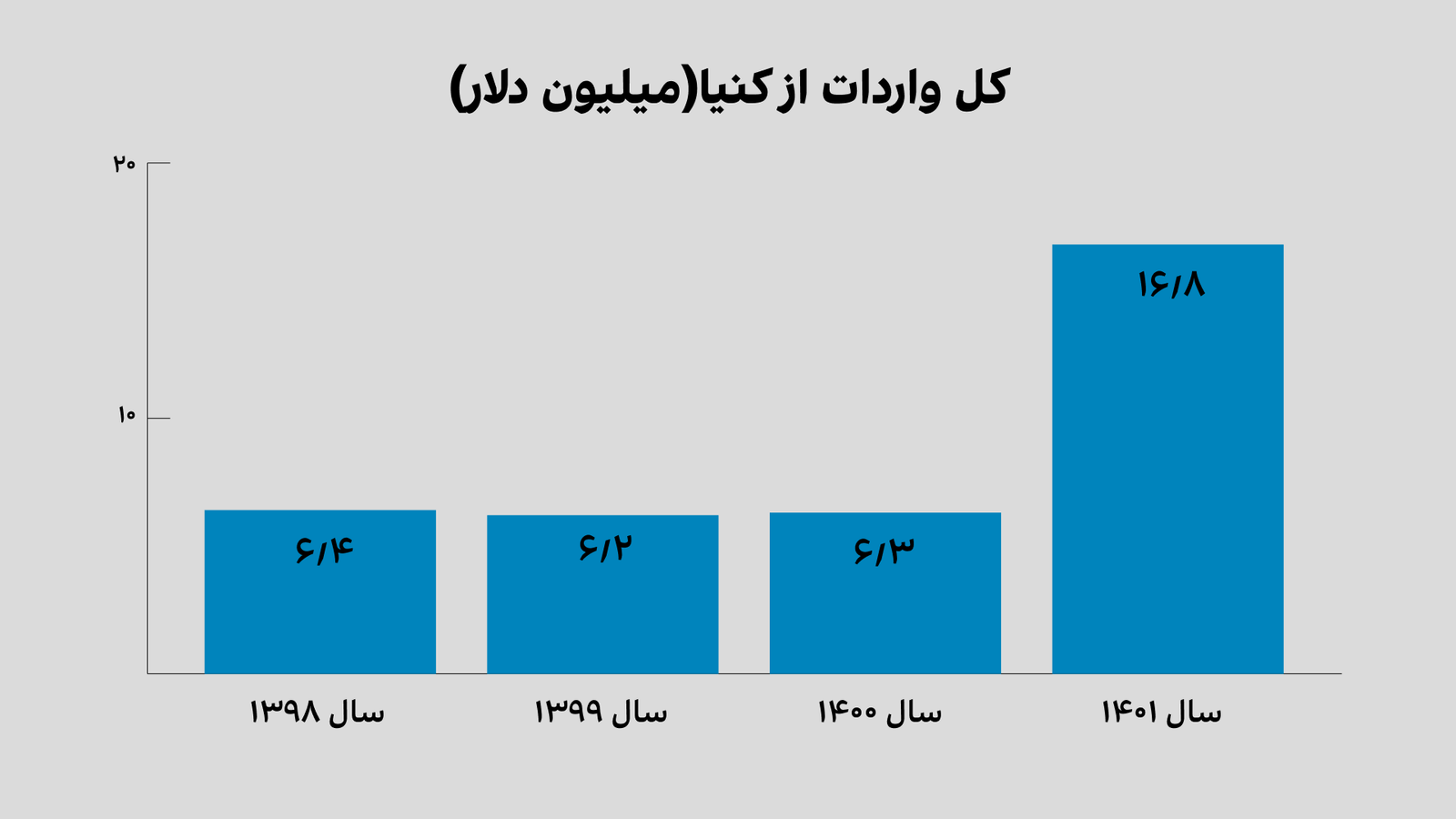 این نمودار کل واردات ایران را از کنیا نشان می‌دهد که عمدتا هم چای است. معمولا کل کشور سالانه شش میلیون دلار از کنیا واردات داشته اما در سال ۱۴۰۱، واردات از کنیا حدود ۱۰ میلیون دلار افزایش داشته است.