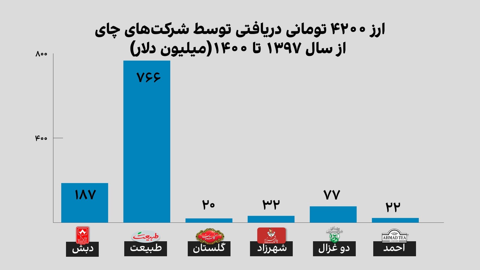 این ماجرا درباره ارز چهار هزار و ۲۰۰ تومانی هم صادق است. گروه چای طبیعت طبق لیست بانک مرکزی طی سال‌های ۱۳۹۷ تا ۱۴۰۰ مبالغی به مراتب بالاتر از چای دبش و مجموع عرضه‌کنندگان دیگر چای، ارز چهار هزار و ۲۰۰ تومانی دریافت کرده است.