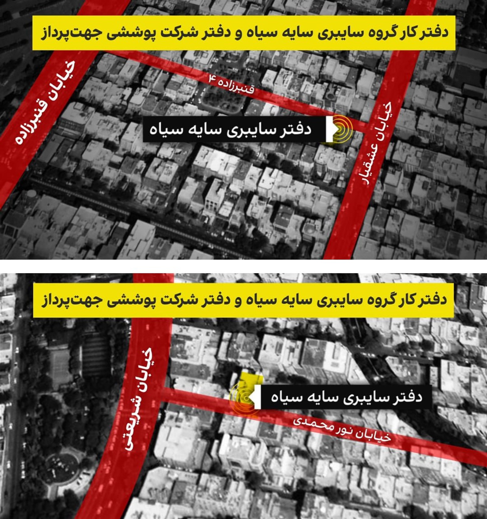 دفاتر عملیاتی گروه سایبری سایه‌ سیاه در دو نقطه تهران قرار دارند: یکی پلاک ۲۳ خیابان نورمحمدی در خیابان شریعتی و دیگری پلاک چهار کوچه قنبرزاده چهار در خیابان عشقیار واقع در بزرگراه سلیمانی.