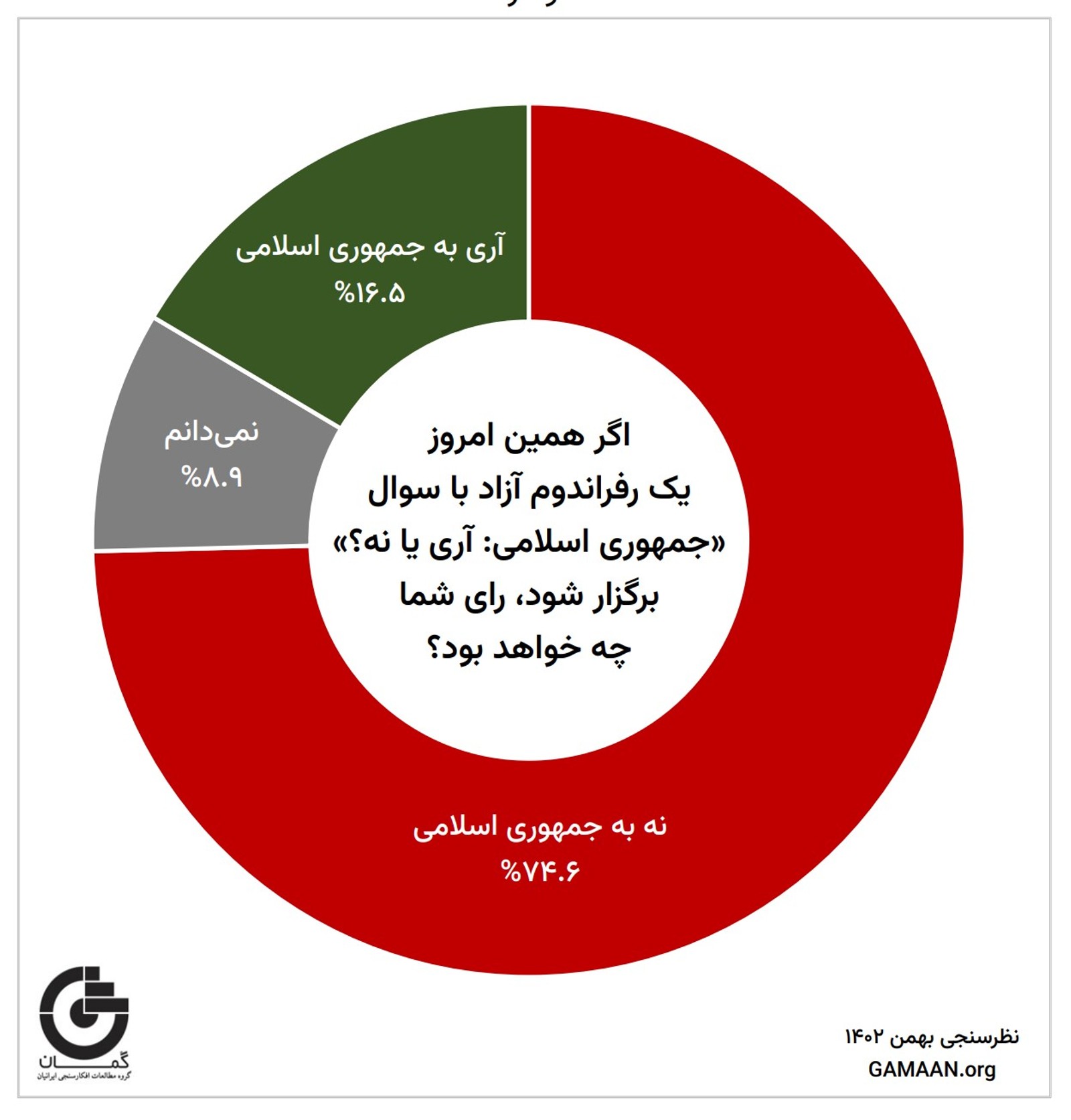 در پاسخ به این پرسش که «اگر همین امروز یک رفراندوم آزاد با سوال "جمهوری اسلامی: آری یا نه؟" برگزار شود، رای شما چه خواهد بود؟» حدود ۷۵ درصد پاسخدهندگان «نه به جمهوری اسلامی» و ۱۶ درصد «آری به جمهوری اسلامی» را انتخاب کردند.