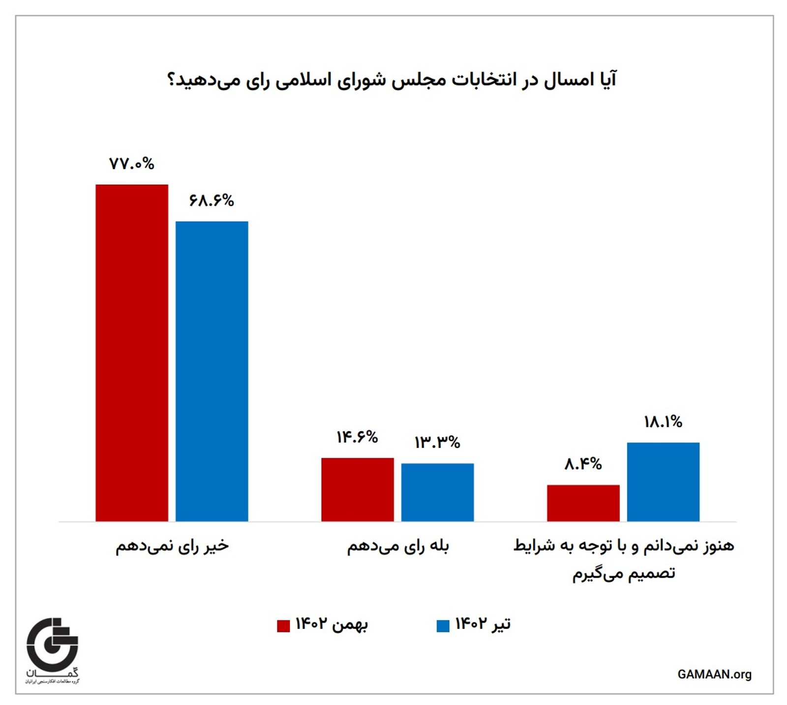 نتایج نظرسنجی «نگرش ایرانیان به انتخابات ۱۴۰۲» که از سوی گروه مطالعات افکارسنجی ایرانیان (گمان) مستقر در هلند انجام شده، نشان میدهد که ۷۷ درصد شرکتکنندگان در این نظرسنجی اعلام کردهاند در انتخابات رای نمیدهند.