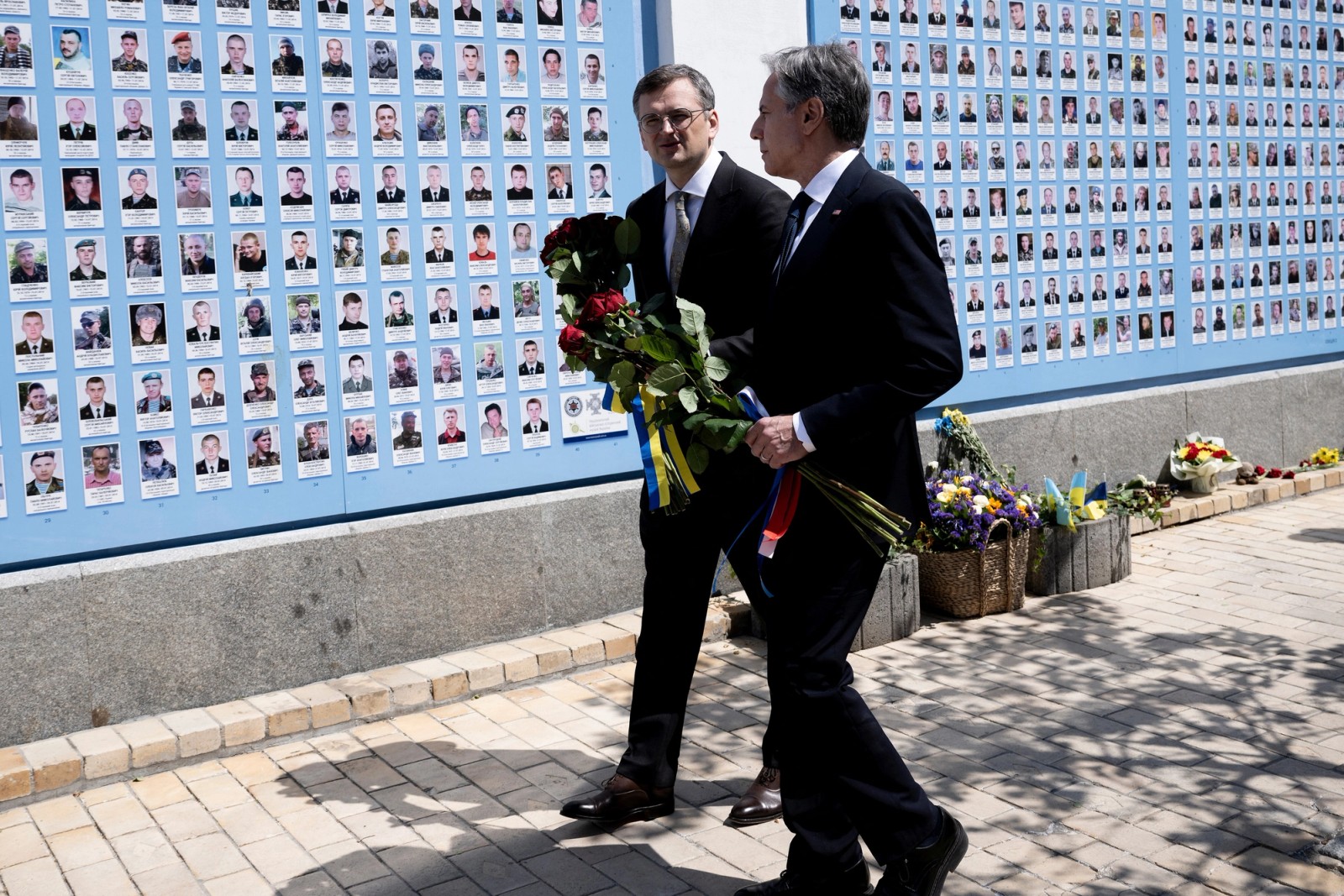 ادای احترام آنتونی بلینکن (سمت راست) و دمیترو کولبا (سمت چپ)، وزیران امور خارجه آمریکا و اوکراین به سربازان کشته شده در نبرد با روسیه، کی‌یف، ۲۶ اردیبهشت