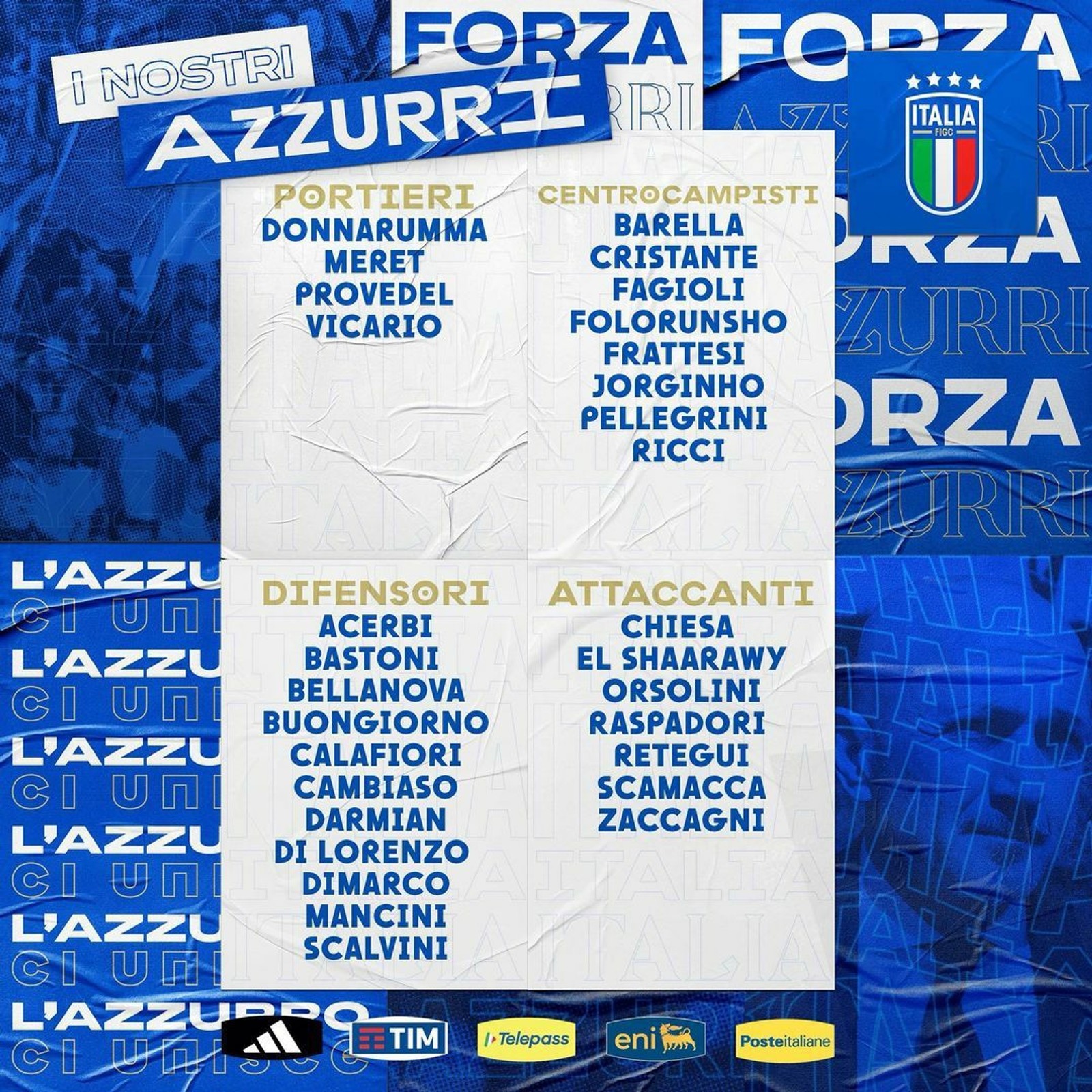 لوچیانو اسپالتی، سرمربی تیم ملی ایتالیا فهرست ۳۰ نفره آتزوری برای مسابقات یورو ۲۰۲۴ را معرفی کرد. از این فهرست ۴ بازیکن خط خواهند خورد. نیکولو فاجیولی، هافبک یوونتوس باوجود محروميت به دلیل شرط‌بندی برای یورو دعوت شده، اما مانوئل لوکاتلی، هم‌تیمی او در یووه غایب بزرگ ایتالیا است.