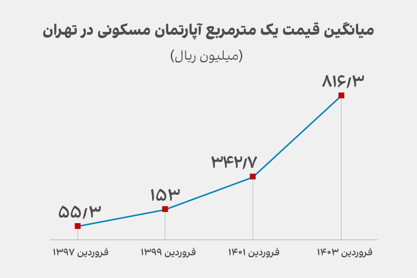 گزارش ماهانه بانک مرکزی از وضعیت بازار مسکن در تهران نشان میدهد میانگین قیمت آپارتمان در تهران در فروردین ۱۴۰۳ نسبت به فروردین پنج سال قبل، یعنی ۱۳۹۷، نزدیک به ۱۴ برابر و دقیقا یکهزار و ۳۷۶ درصد افزایش داشته است. در حالی که در این مدت، حداقل حقوق حدود ۶۸۰ درصد افزایش یافته است.