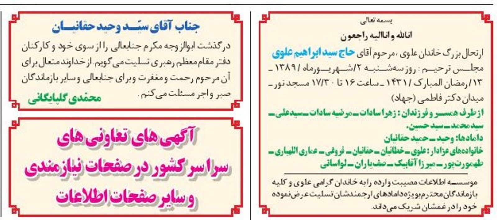 آگهیهای تسلیتی که در صفحه اول روزنامه اطلاعات در مرداد سال ۱۳۸۹ منتشر شده، نشان میدهد «زهرا سادات علوی» همسر حقانیان است و اتفاقا برادرش حمید حقانیان که مهرماه سال ۱۴۰۲ در گذشت، هم با خواهر زهرا سادات علوی، یعنی مرضیه سادات علوی ازدواج کرده بوده است.