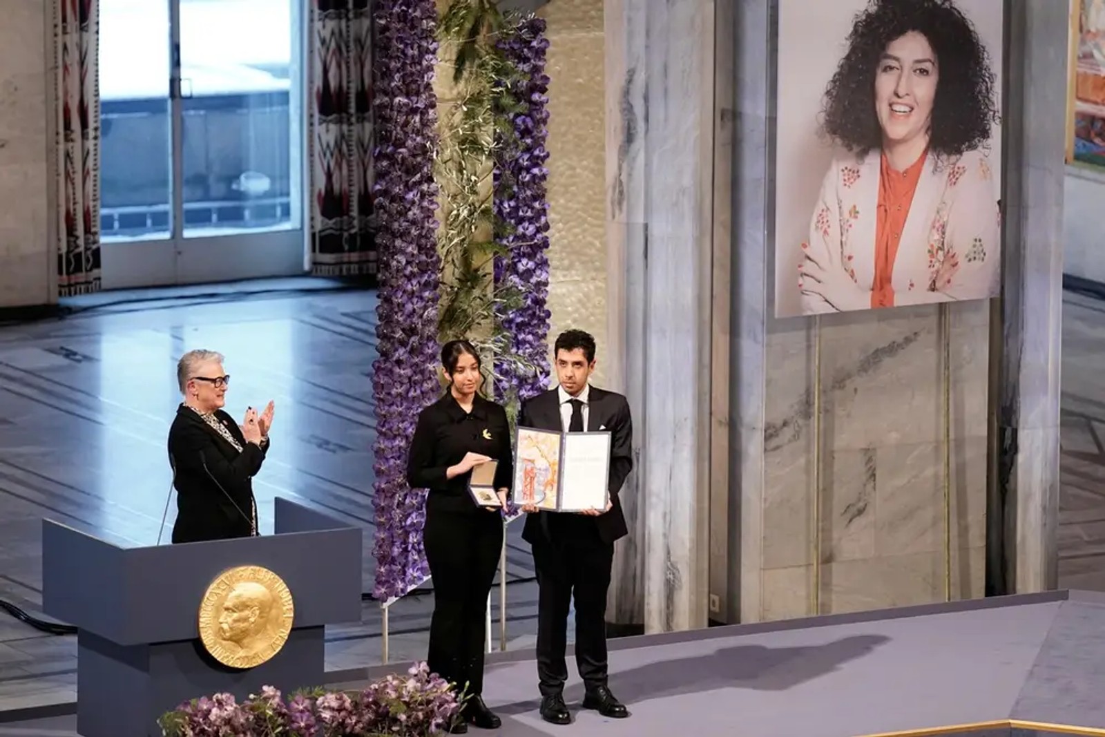تصویری از کیانا و علی رحمانی، فرزندان نرگس محمدی، هنگام دریافت جایزه نوبل صلح سال ۲۰۲۳