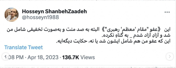 او ۹ تیر ۱۴۰۱ به زندان رفت و پیش از موعد و پس از نزدیک به ۱۰ ماه حبس، ۲۹ فروردین ۱۴۰۲ با نوشتن توئیتی خبر از آزادی زودهنگامش داد و نوشت که او مشمول عفو شده است اما اینکه رهبر هم مشمول عفو شده است یا نه، حکایت دیگری است.