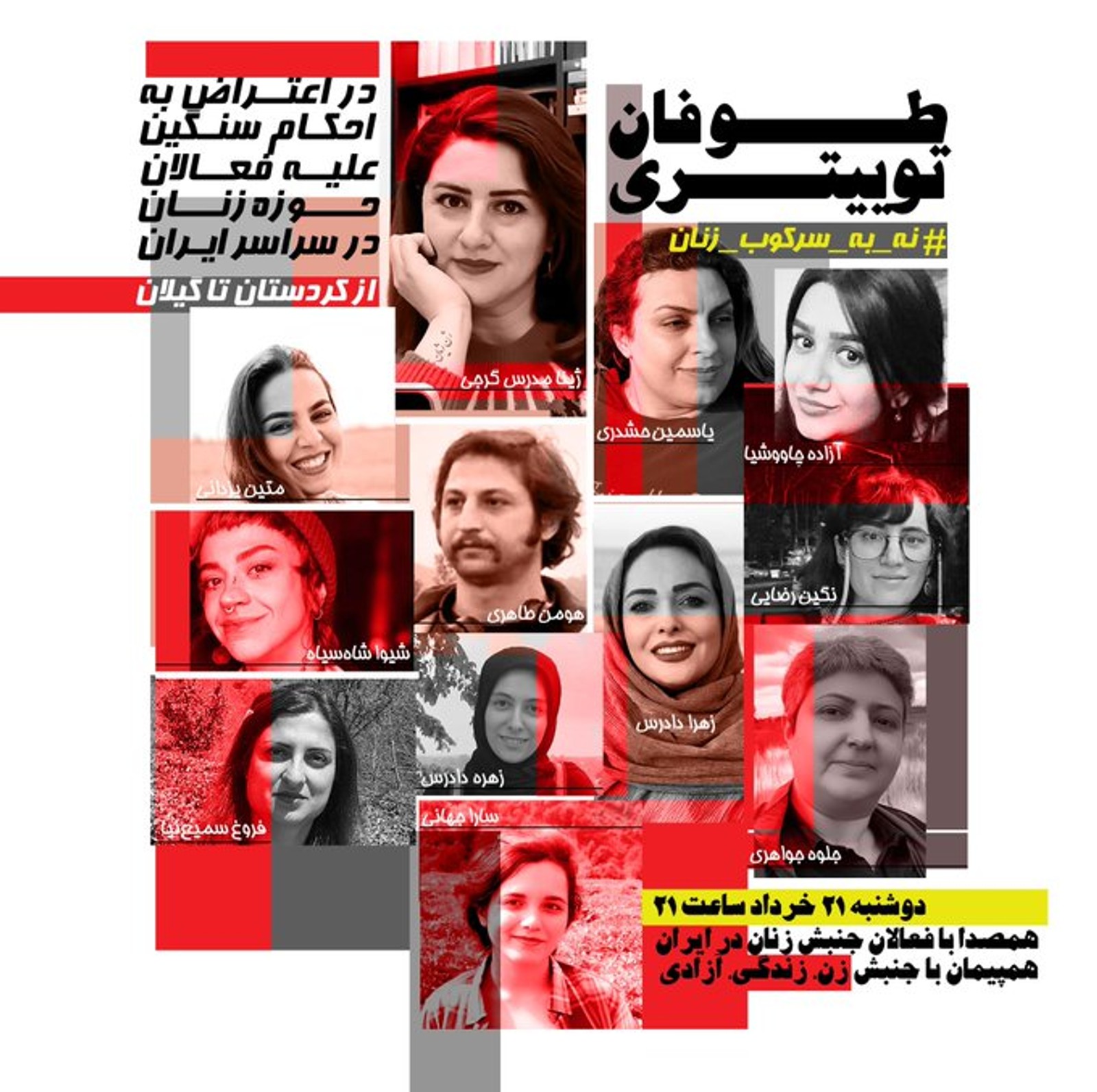 این طوفان توییتری شامگاه دوشنبه ۲۱ خرداد با هشتگ «نه به سرکوب زنان» در اعتراض به صدور احکام سنگین علیه فعالان حوزه زنان سراسر ایران از کردستان تا گیلان به راه افتاد.