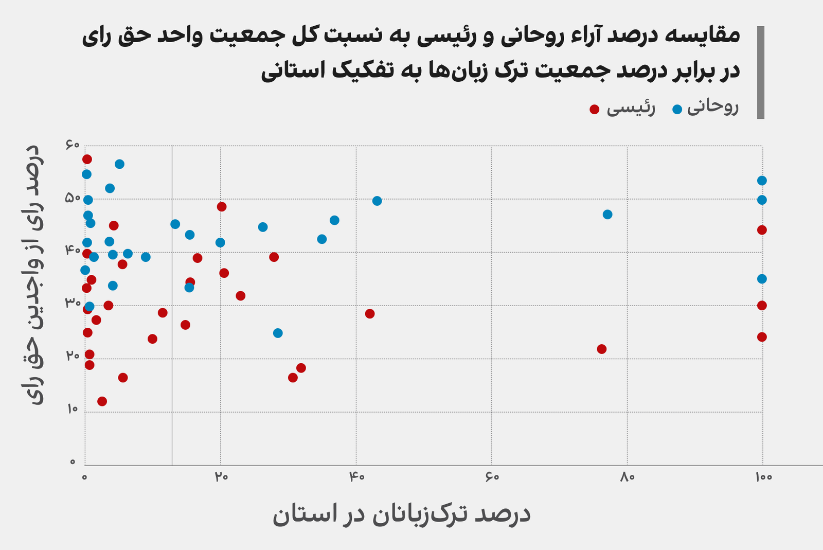 همانگونه که مشاهده میشود توزیع رایهای روحانی در استانها حالت همگنتری داشته و تاثیر متغیر هویت ترکی کمتر است. البته روحانی نیز رای بیشتری در استانهای با جمعیت مسلط ترکزبان منهای زنجان دارد اما این برتری در نقاط غیر قومیت نشین نیز تقریبا برقرار است. در استان زنجان، رئیسی بیشتر از روحانی رای آورده بود.