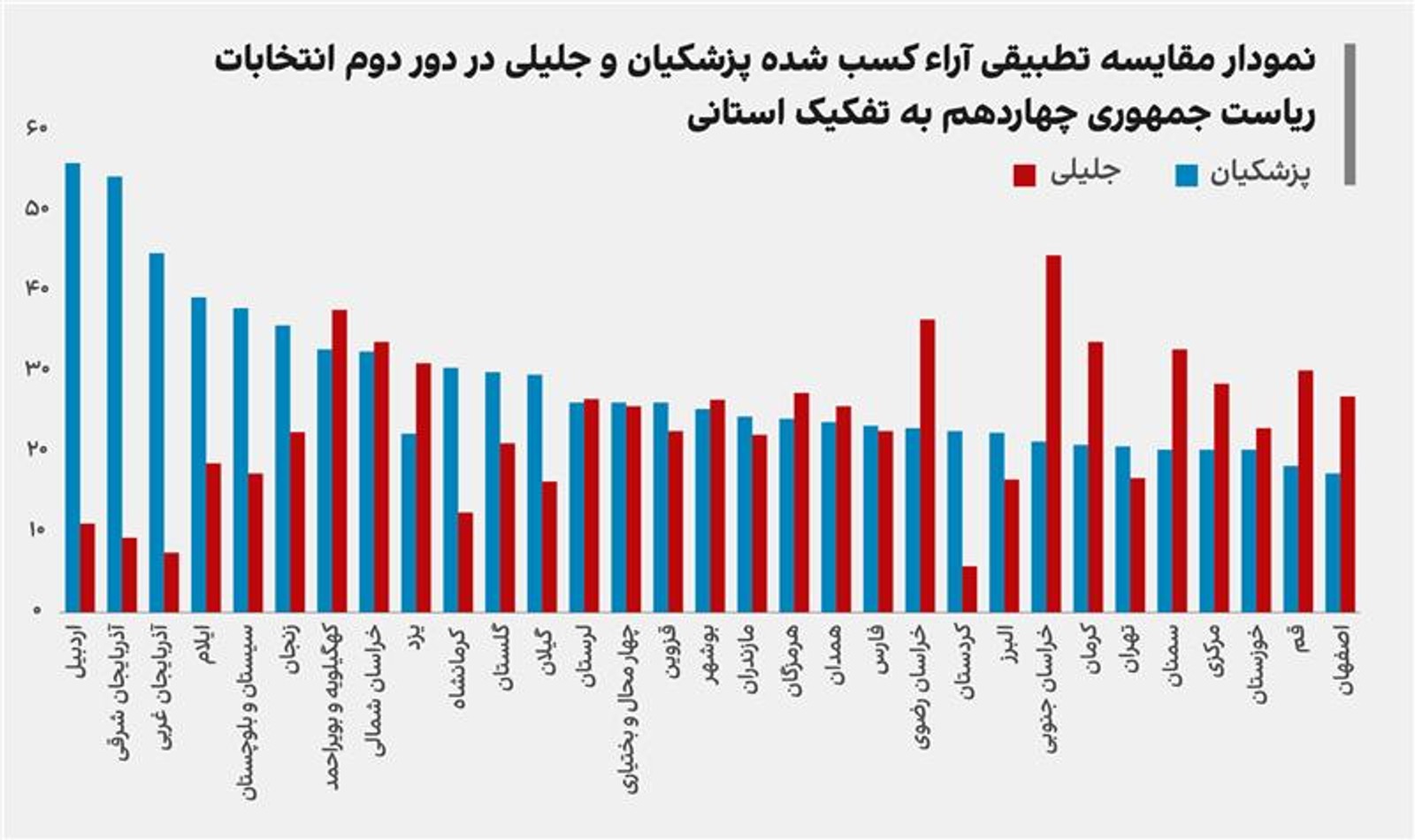 تفاوت آراء کسب شده پزشکیان به جلیلی در استانهای ترک نشین در دور دوم در حدود دو میلیون و هشت و شصت و یک هزار رای بالاتر است که تقریبا یک میلیون رای از فاصله آنها در دور اول بیشتر است. در حالی که در شش استان که تکلم به فارسی در آنها مسلط است، این برتری معکوس شده و جلیلی تقریبا هشت و سی و نه هزار رای بیشتر به دست آورده است!.