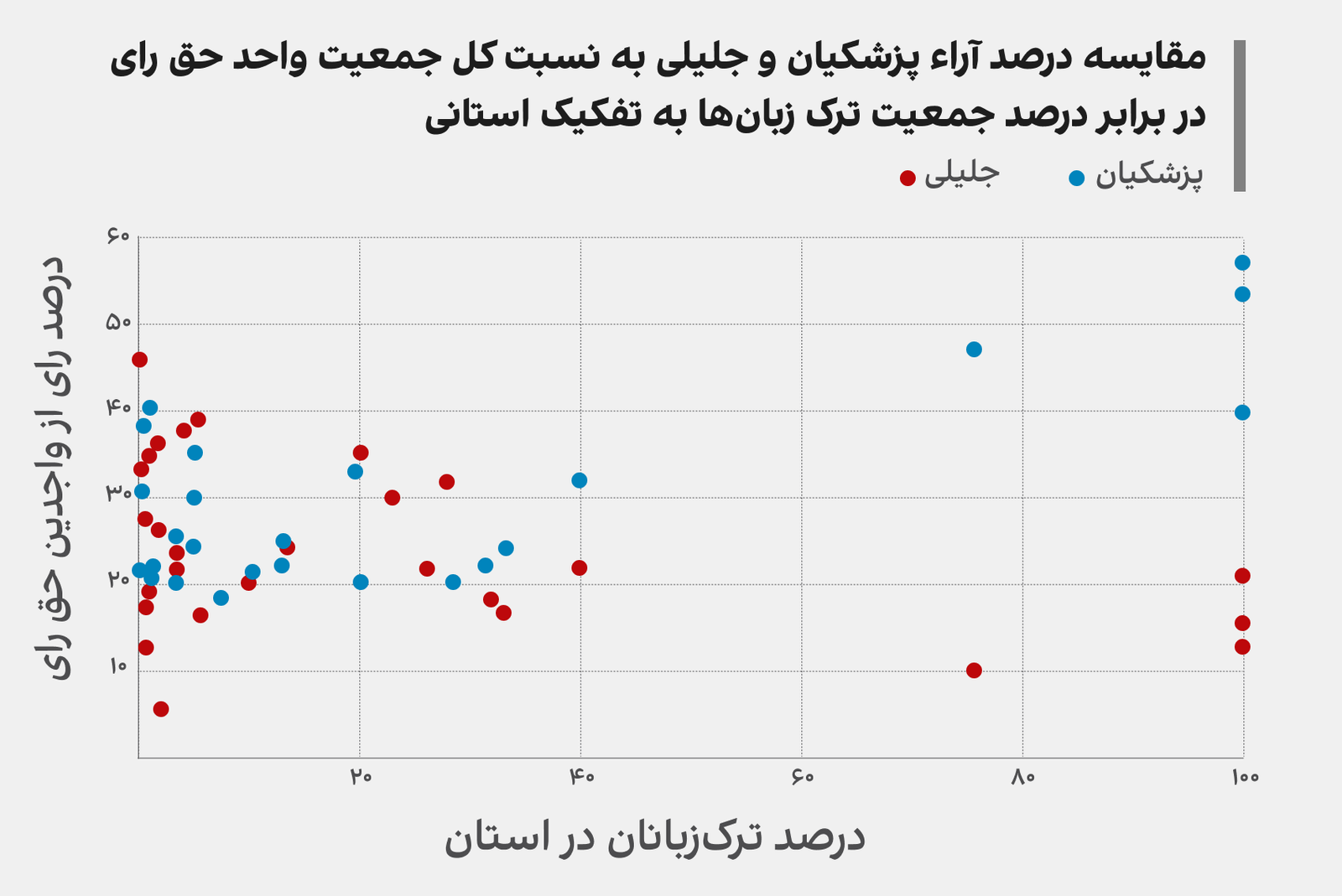 برای روشن شدن نقش ترکها در پیروزی پزشکیان نمودار پراکندگی (Scatter Plot) زیر روشنگر است. محور افقی درصد جمعیت ترکزبان در هر استان را نشان میدهد. محور عمودی سهم رای هر کاندیدا (پزشکیان و جلیلی) در مرحله دوم انتخابات از آراء بالقوه (جمعیت واجد حق رای) در هر استان را نمایندگی میکند.