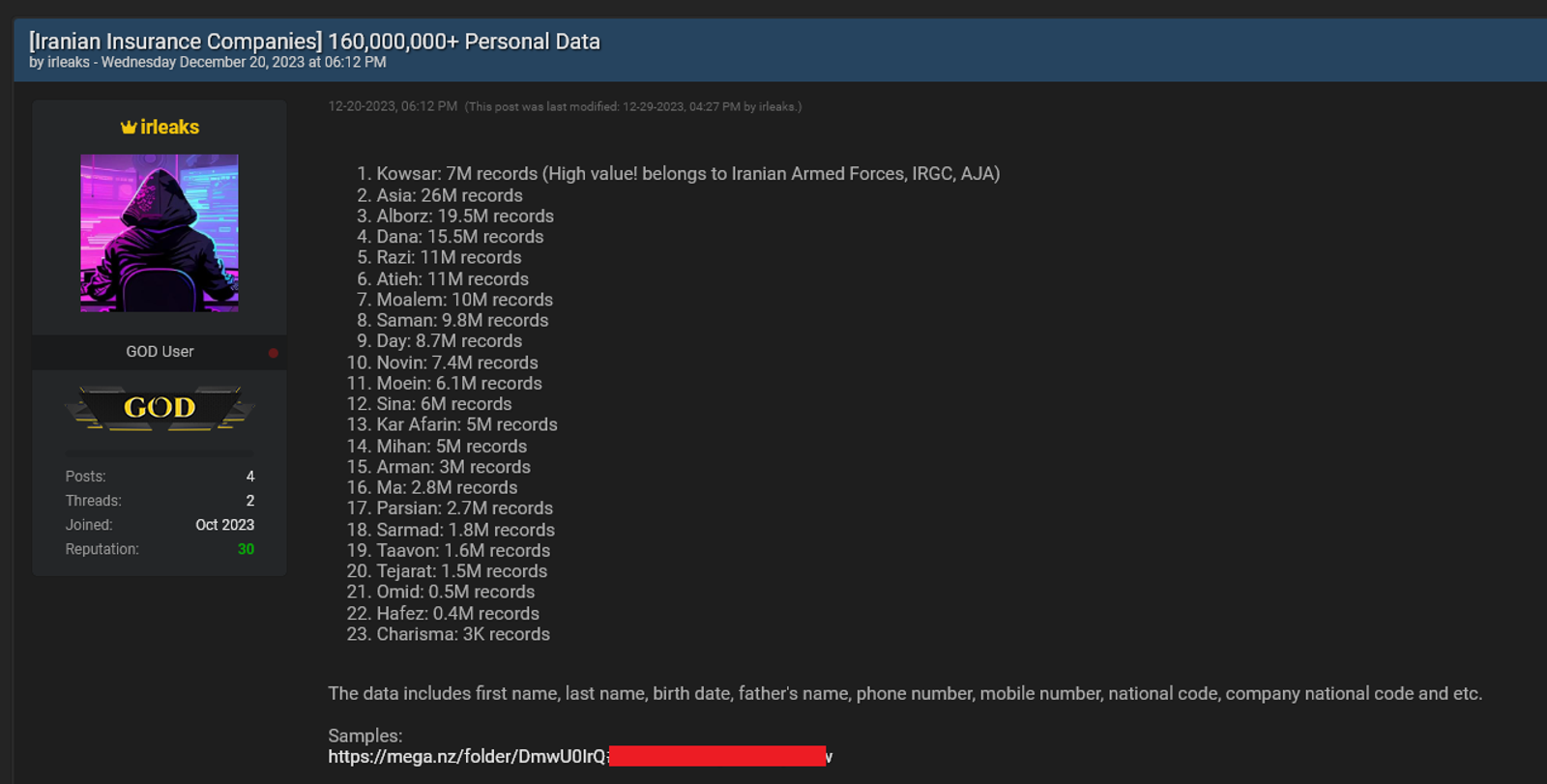 ایران نیز با چنین حملاتی بیگانه نیست. در ماه دسامبر، آی‌آرلیکس ( IRleaks) ادعا کرد که اطلاعات مشتریان نزدیک به ۲۰ شرکت بیمه ایرانی را به سرقت برده است و اسنپ فود، یک سرویس تحویل غذا، را هک کرده است.
