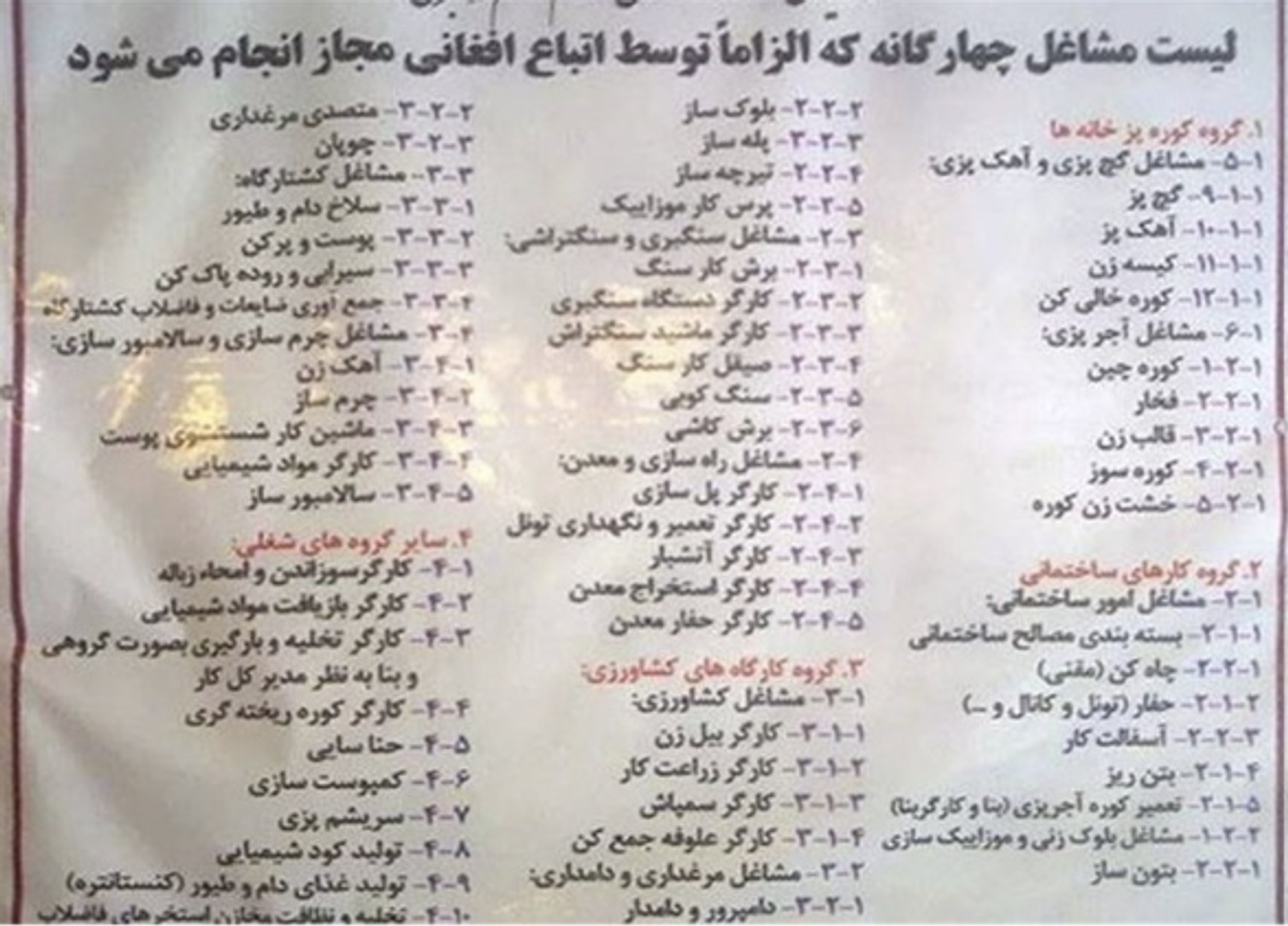 تبعیض در حوزه اشتغال طبق قانون کار ایران، اتباع خارجی میتوانند فقط در شغلهای مجاز که از طرف دولت تعیین میشود فعالیت کنند. در این میان، مهاجران افغانستانی تنها در برخی مشاغل خاص مجاز به کار هستند. این مشاغل در چهارگروه «کورهپزخانه»، «کارهای ساختمانی»، «کارگاههای کشاورزی» و «سایر مشاغل» که شامل شغلهایی از قبیل تولید کود شیمیایی، سوزاندن زباله و... است دستهبندی شده است.