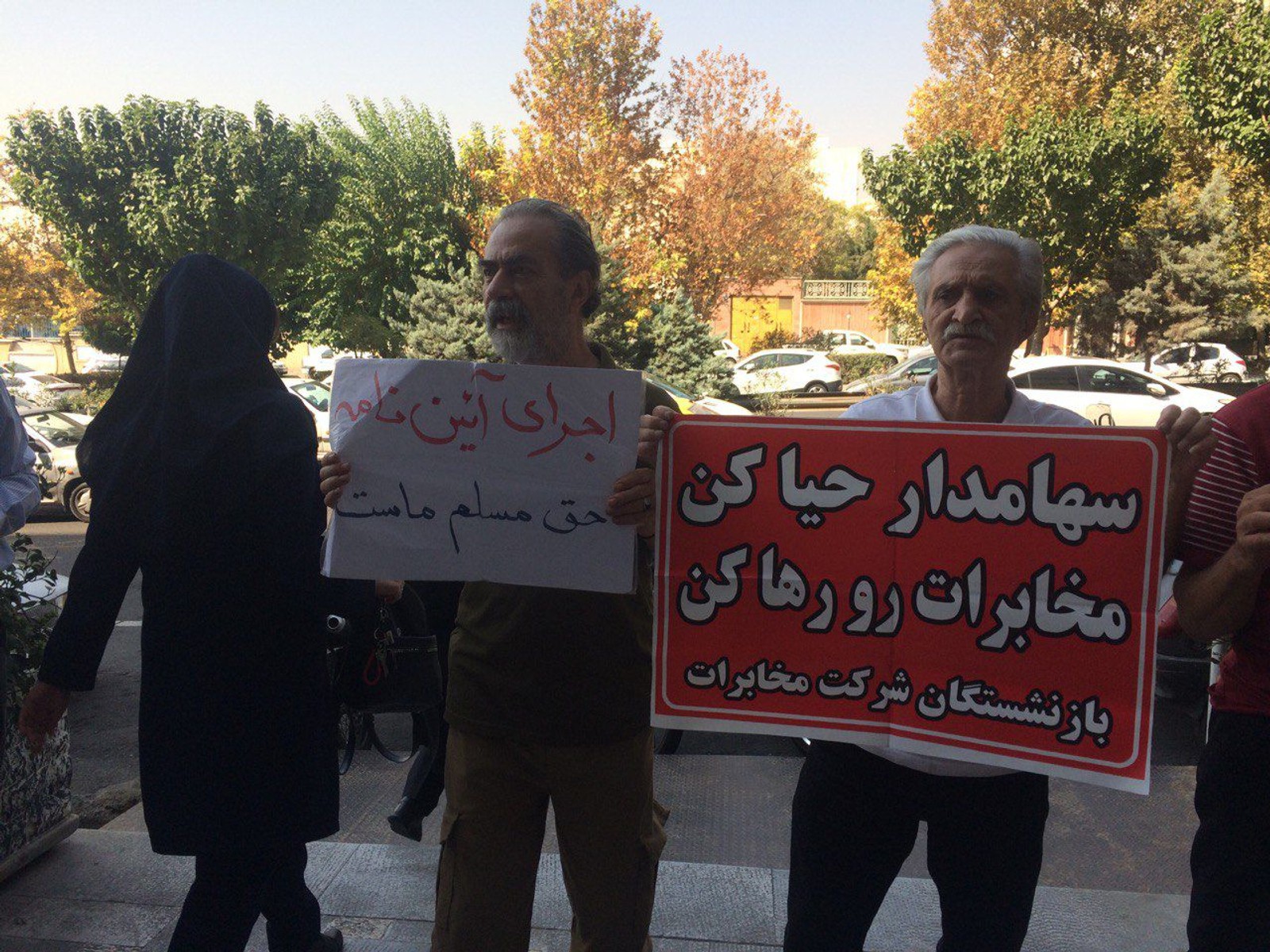 بازنشستگان معترض در اهواز، تبریز و تهران، «ستاد اجرایی فرمان امام» و «بنیاد تعاون سپاه پاسداران» را که سهامداران عمده شرکت مخابرات هستند، مخاطب قرار دادند و پلاکاردهایی با شعار «سهامدار حیا کن/ مخابرات رو رها کن» در دست گرفتند.