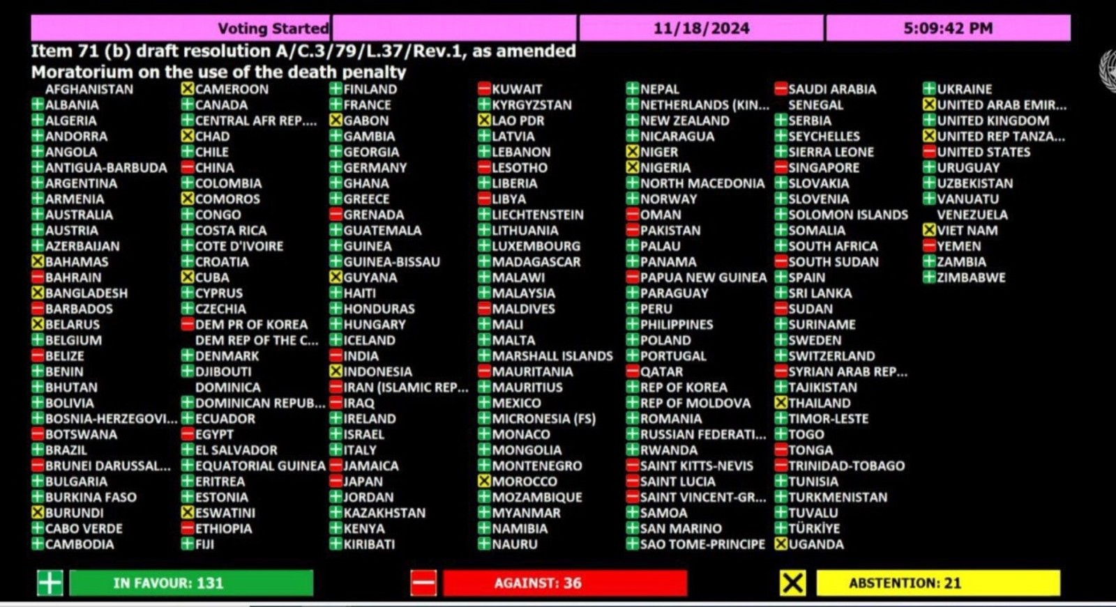 در هفتاد و نهمین جلسه مجمع عمومی سازمان ملل متحد، ذیل دستور کاری با عنوان «ارتقا و حمایت از حقوق بشر؛ مسائل حقوق بشر از جمله رویکردهای جایگزین برای بهبود بهره‌مندی موثر از حقوق بشر و آزادی‌های اساسی»، پیش‌نویس قطعنامه‌ای با عنوان «تعلیق استفاده از مجازات اعدام» ارائه شد.