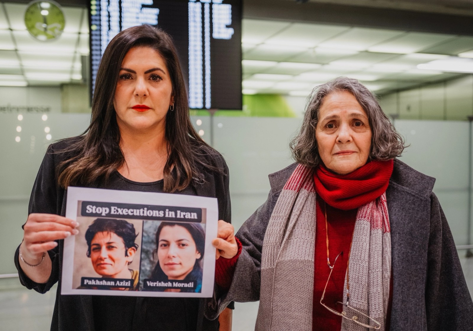 ناهید تقوی و دخترش مریم در فرودگاه تصاویر وریشه مرادی و پخشان عزیزی، دو زندانی سیاسی محکوم به اعدام را در دست دارند