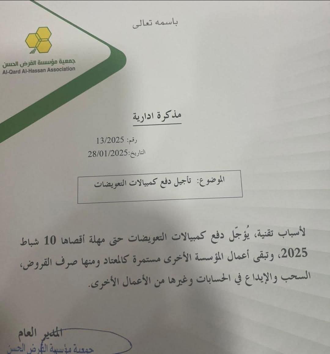 تصویری که از نامه یک موسسه قرضالحسنه در لبنان منتشر شده، نشان میدهد این نهاد پرداخت پول در قبال چکهای حزبالله برای جبران خسارات جنگ به شهروندان لبنانی را به تعویق انداخته است.