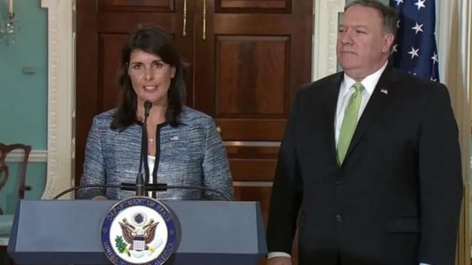 پمپئو و هیلی، در کنفرانسی خبری، ۳۰ خرداد ۱۳۹۷