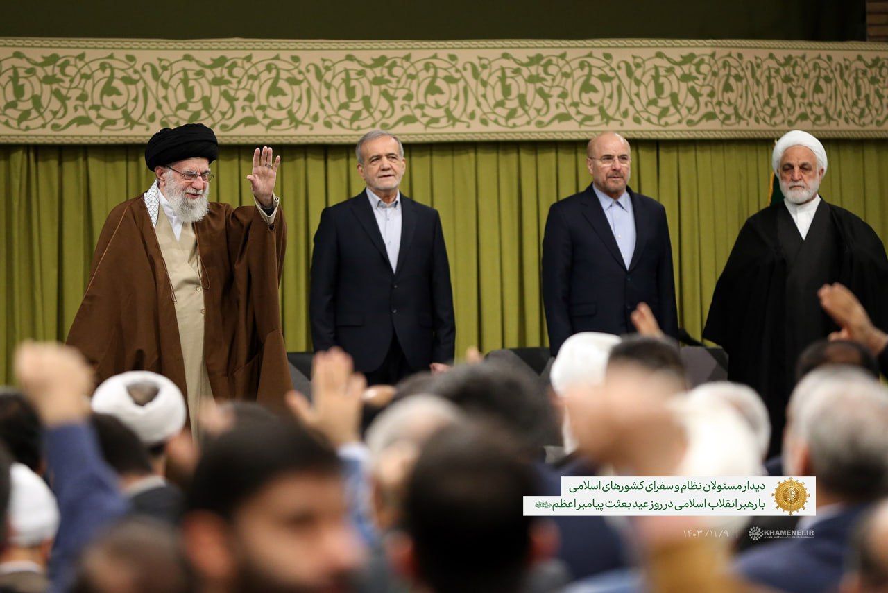 علی خامنه‌ای، رهبر جمهوری اسلامی، با ابراز حمایت از سخنان مسعود پزشکیان علیه آمریکا و دونالد ترامپ در راهپیمایی ۲۲ بهمن، گفت سخنان او «صریح و راهگشا» بود و آن‌چه را که «لازم بود» بیان کند، گفت. خامنه‌ای افزود پزشکیان «از زبان مردم و سخن دل مردم را بیان کرد.»