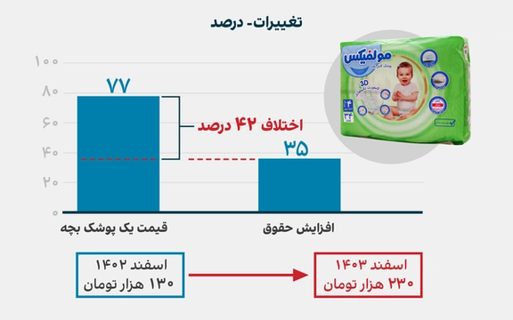 شهروند دیگری از تهران میگوید قیمت پوشک مولفیکس سال گذشته در اسفندماه ۱۲۰ هزار تومان بوده که اکنون آن را ۲۹۰ هزار تومان تهیه میکند.