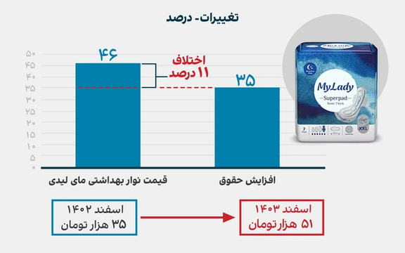 او درباره قیمت پد بهداشتی هم میگوید قیمت این محصول در فاصله اسفند ۱۴۰۲ تا اسفند ۱۴۰۳ از ۴۰ هزار تومان به ۷۷ هزار تومان رسیده است.
