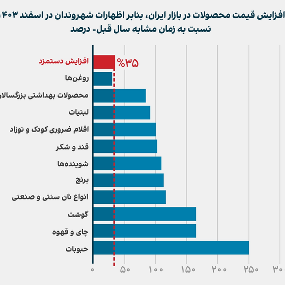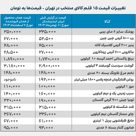 قیمت مواد غذایی و اقلام مصرفی در فروشگاههای شهرهای تهران، شیراز، اصفهان، نوشهر، جاسک، قزوین، مشهد، تبریز، خرمآباد و کرمانشاه، نشان میدهد در هفته اول اسفندماه ۱۴۰۳، قیمت اقلام مصرفی خانوارها از ۲۲ تا ۳۶۰ درصد و به طور میانگین یکونیم برابر، معادل ۱۵۰ درصد افزایش داشته است.