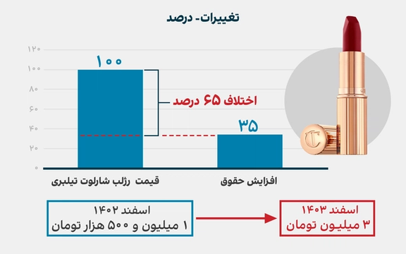 در نمونهای دیگر، رژ لب استایلج از ۸۰۰ هزار تومان به یک میلیون و ۶۰۰ هزار تومان رسیده است.