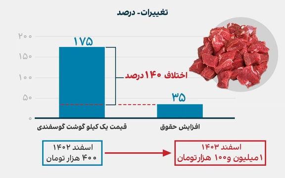 گوشت و برنج؛ در اقلام پرکاربردتر، قیمت یک کیلو گوشت گوسفندی که اسفند سال گذشته ۴۰۰ هزار تومان بود، اکنون به یک میلیون و ۱۰۰ هزار تومان رسیده است.