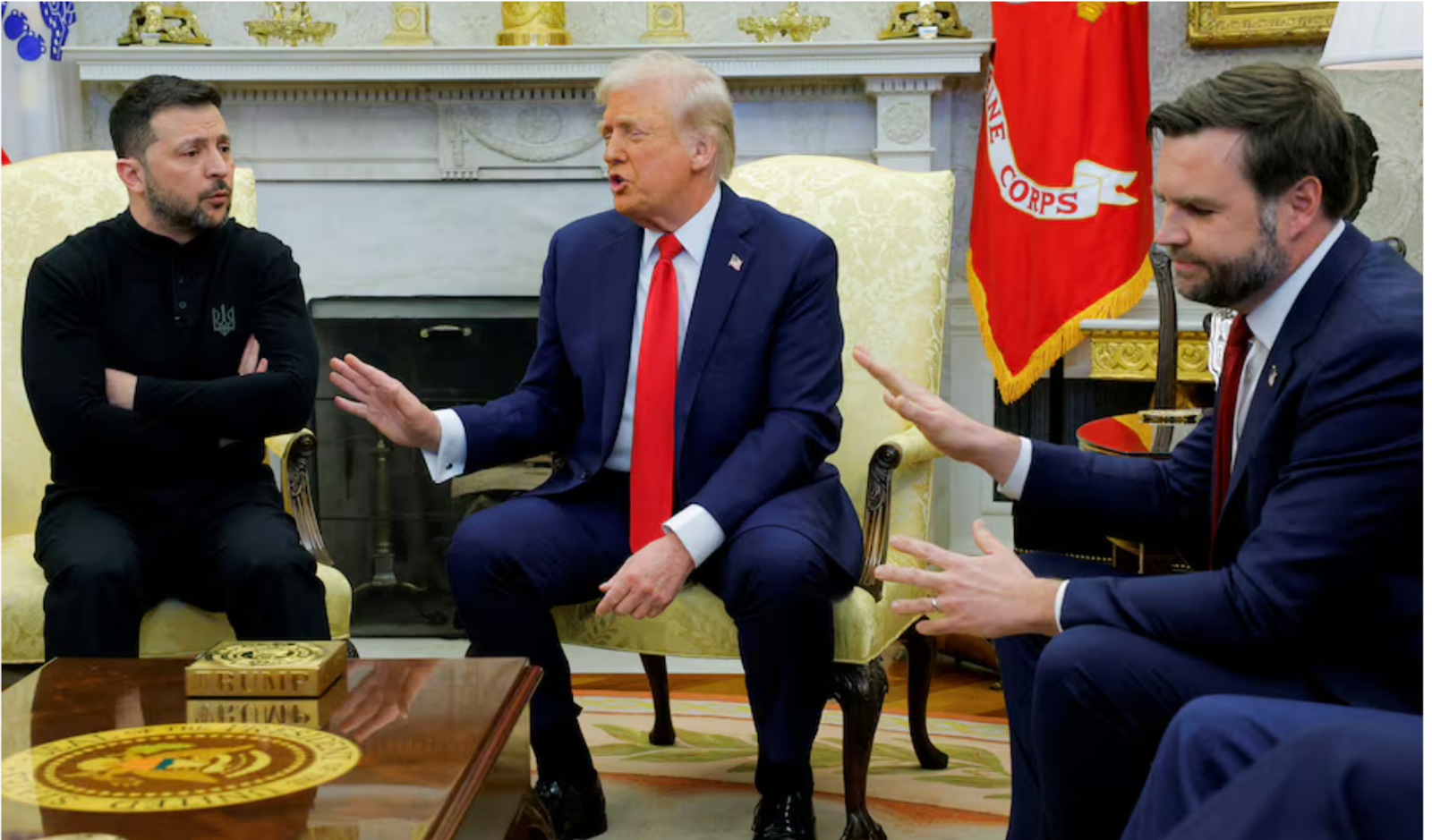 دونالد ترامپ، رییس‌جمهوری آمریکا و مشاوران ارشدش پس از درگیری لفظی با ولودیمیر زلنسکی، رییس‌جمهوری اوکراین، در مقابل دوربین خبرنگاران، در دفتر بیضی کاخ سفید جمع شدند و در نهایت ترامپ تصمیم گرفت ادامه برنامه‌های روز با زلنسکی لغو شود و زلنسکی باید کاخ سفید را بلافاصله ترک کند.