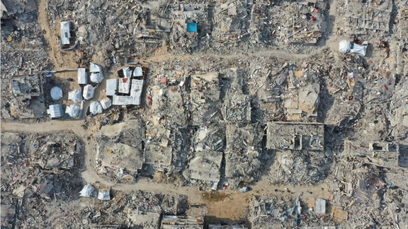 زنان فلسطینی در میان ویرانه‌های برجا مانده از درگیری‌ها در خان یونس، جنوب غزه، ۱۹ اسفند