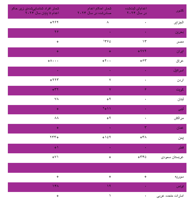 در یمن، شمار اعدامها با ثبت ۳۸ مورد، بیش از دو برابر سال ۲۰۲۳ شده است. در کویت ۶ مورد و در مصر ۱۳ مورد اعدام ثبت شده است. عمان نیز پس از سه سال وقفه، بار دیگر به اجرای حکم اعدام روی آورد.