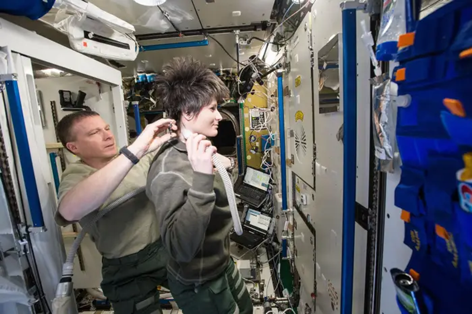 شش ماه بدون مراجعه به آرایشگاه زمان زیادی است. فضانوردان برای کوتاه کردن موهای خود در فضا از جاروبرقی مخصوصی استفاده میکنند که موهای بریدهشده را بلافاصله جمعآوری میکند.