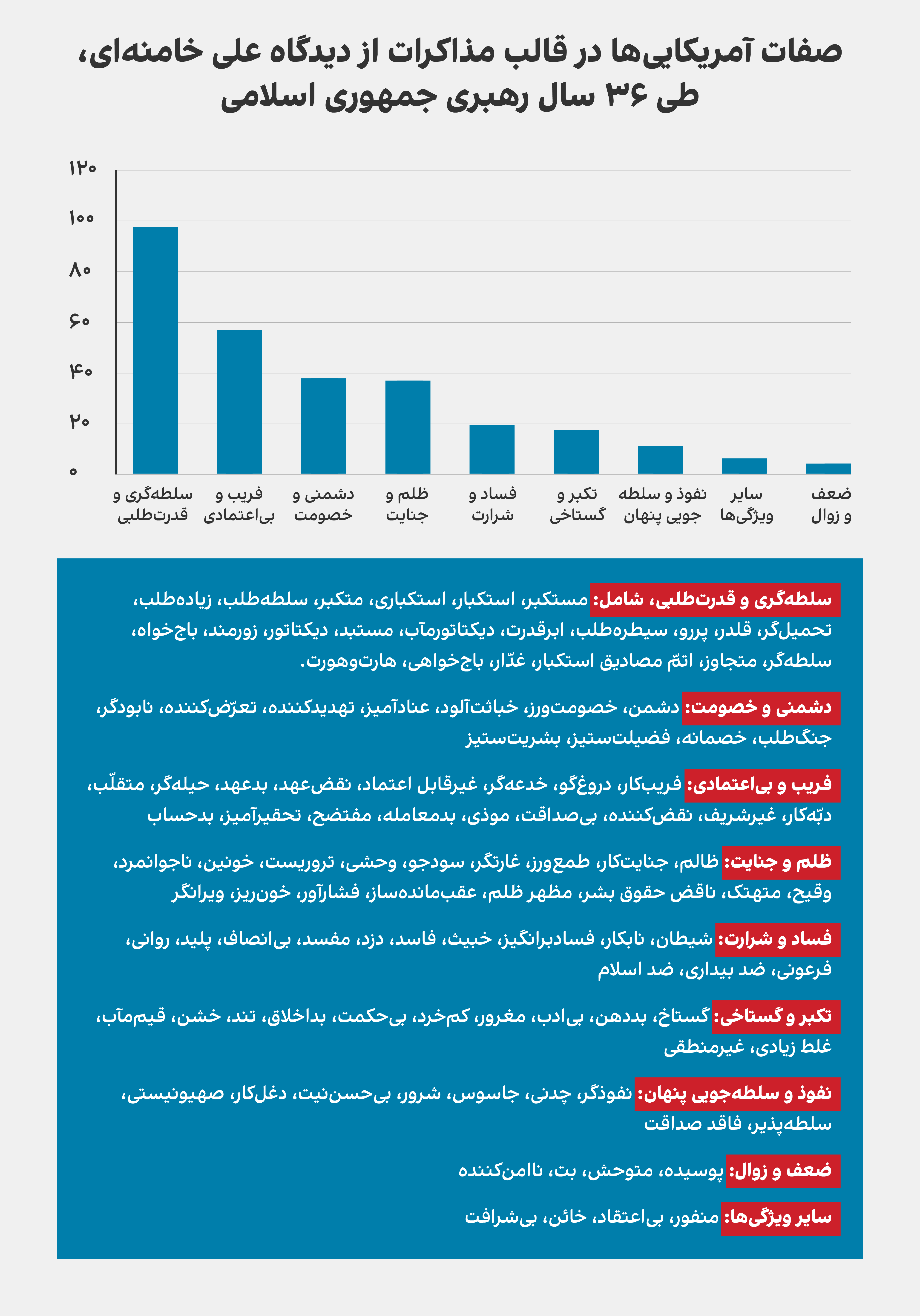 دادهها نشان میدهند نگاه رهبر جمهوری اسلامی به هویت سیاسی و اخلاقی آمریکاییها بهشدت خصمانه و منفی است.
