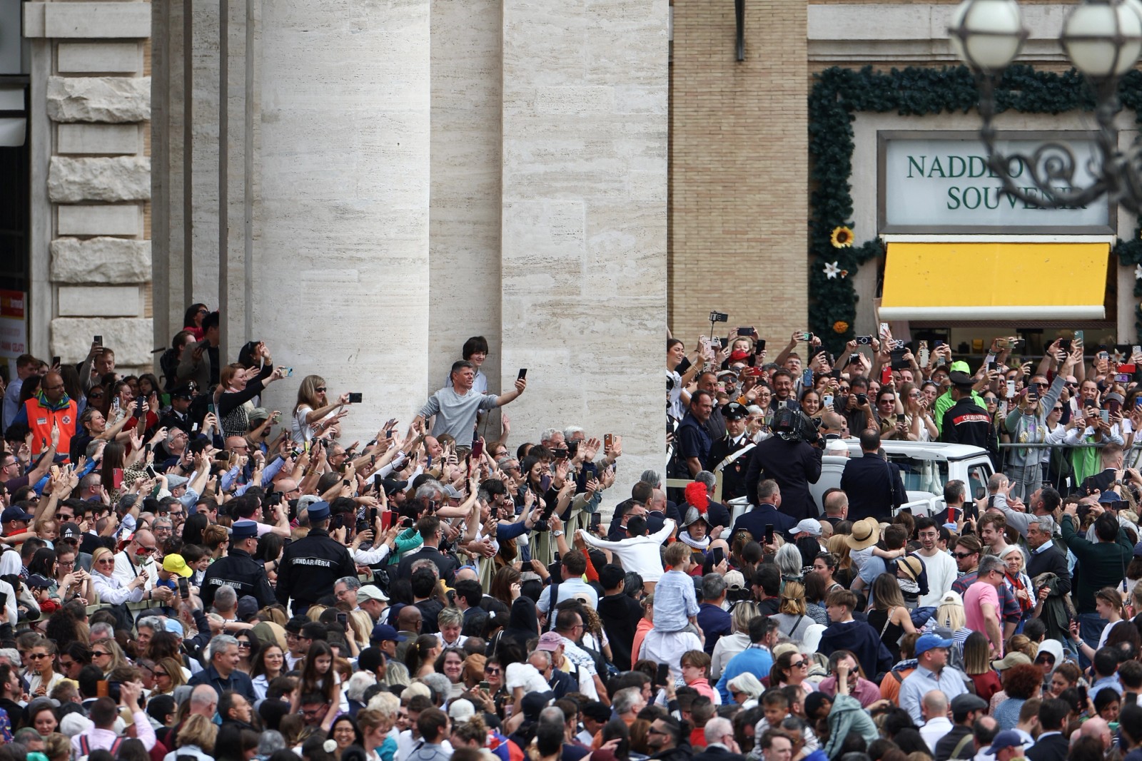 این پاپ ۸۸ ساله بر روی یک صندلی‌ بلند در قسمت پشتی خودرو سفیدرنگ خود نشسته بود، در حالی که مردم در امتداد راهروهای میدان صف کشیده بودند و فریاد می‌زدند: زنده باد پاپ!