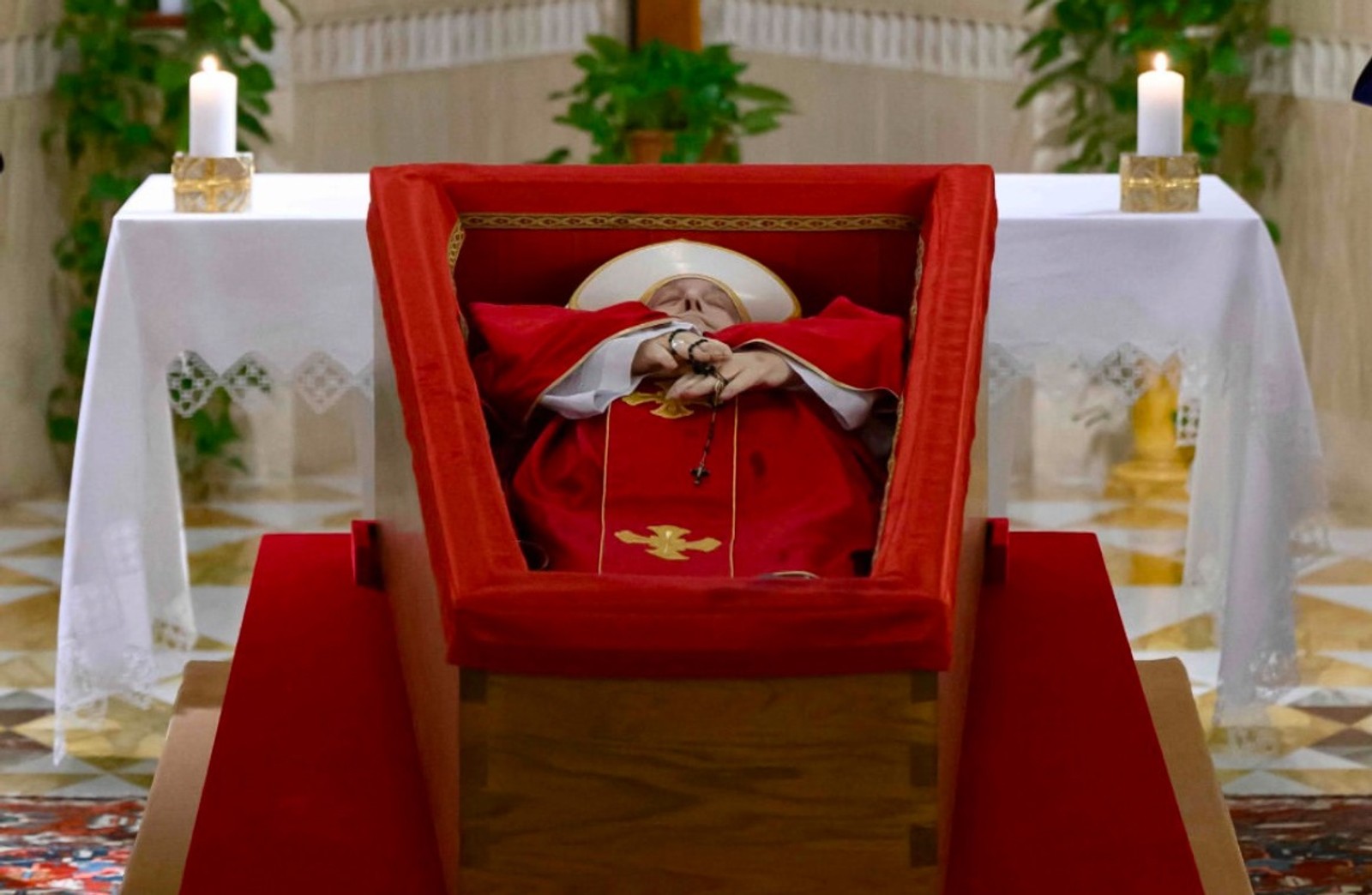 واتیکان نخستین تصاویر از پاپ فرانسیس را که دوشنبه یکم اردیبهشت در ۸۸ سالگی درگذشت، در تابوت منتشر کرد.