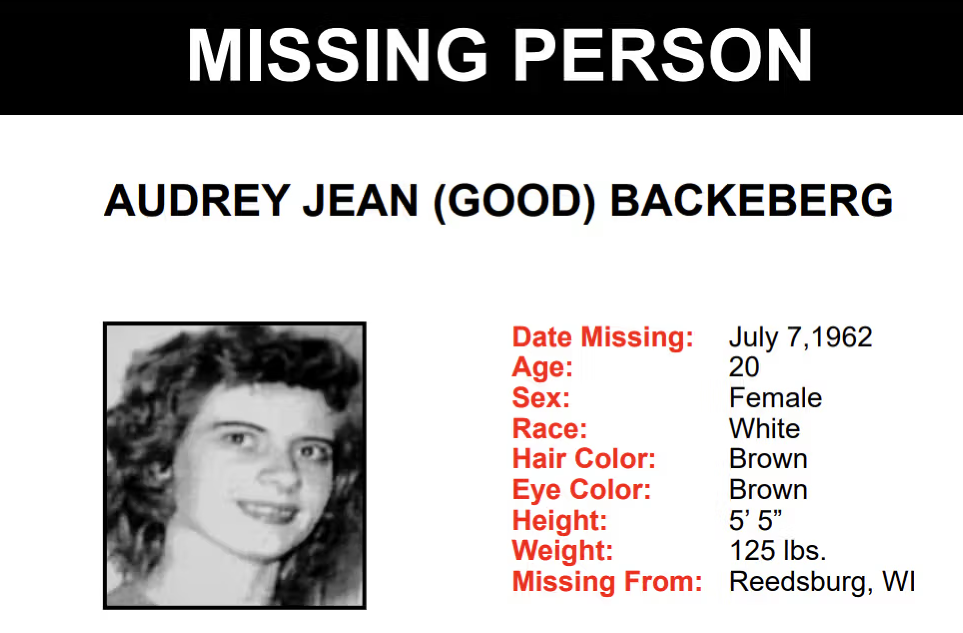 آدری جِین بَکبِرگ، که اکنون ۸۲ سال دارد، تابستان سال ۱۹۶۲، وقتی ۲۰ ساله بود از شهر کوچک محل زندگیاش در ۹۵ کیلومتری شمال غربی مدیسون، پایتخت ایالت ویسکانسین، ناپدید شد.