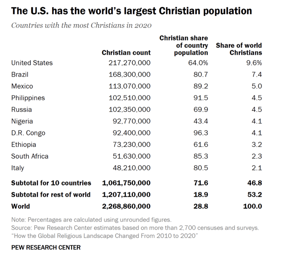 ایالات متحده همچنان میزبان بزرگترین جمعیت مسیحی در میان کشورهای جهان است؛ با حدود ۶۴ درصد از جمعیت این کشور که در سال ۲۰۲۰ خود را مسیحی معرفی کردهاند.