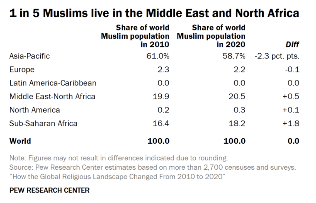 بر پایه این گزارش، تمرکز جمعیتی مسلمانان جهان تا حدودی از منطقه آسیا-اقیانوسیه به آفریقای جنوب صحرا (آفریقای سیاه) منتقل شده است. اکنون ۱۸ درصد از مسلمانان جهان در آفریقای جنوب صحرا (آفریقای سیاه) زندگی میکنند که نسبت به سال ۲۰۱۰، دو درصد بیشتر شده است.