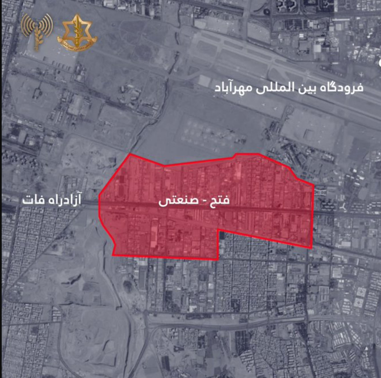 افیخای ادرعی ضمن صدور «هشدار فوری به کارکنان و نیز کلیه افرادی که در منطقه ۱۸ تهران بر اساس ناحیه مشخصشده بر روی نقشه ضمیمه قرار دارند»، اعلام کرد اسرائیل «برای حمله به زیرساختهای نظامی رژیم ایران وارد عمل خواهد شد».
